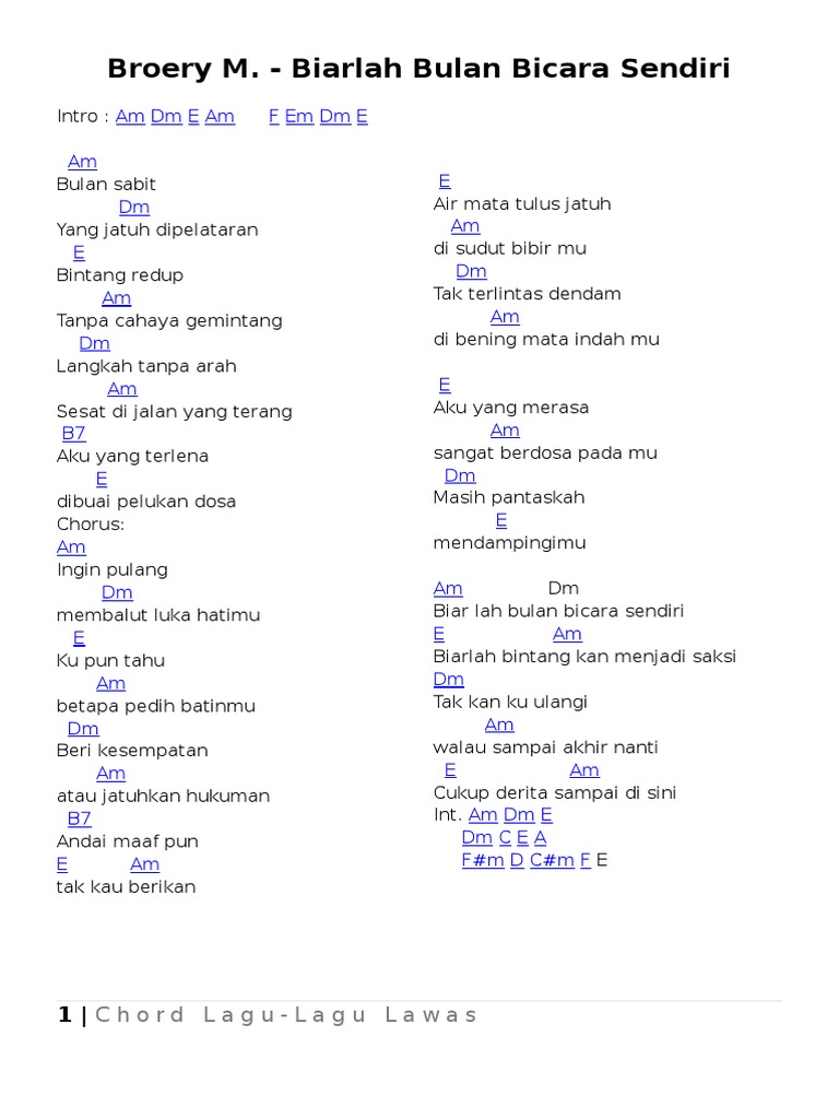 Lirik lagu biarlah bulan bicara dari beroery marantika lagu ini adalah salah satu lagu yang dipopulerkan oleh beroery marantika silahkan selengkapnya baca disini. Am bulan sabit dm yang jatuh dipelataran e bintang redup am tanpa cahaya gemintang dm langkah tanpa arah am sesat di jalan yang terang b7 aku chorus am dm biar lah bulan bicara sendiri e am biarlah bintang kan menjadi saksi dm tak kan ku ulangi am walau sampai akhir nanti e am. Angkasa biarlah bulan bicara lirik. Biarlah bulan bicara bulan sabit yang jatuh di pelataran bintang redup tanpa cahaya gemintang langkah tanpa arah, sesat di. Biarlah bulan bicara broery marantika siho live acoustic cover.