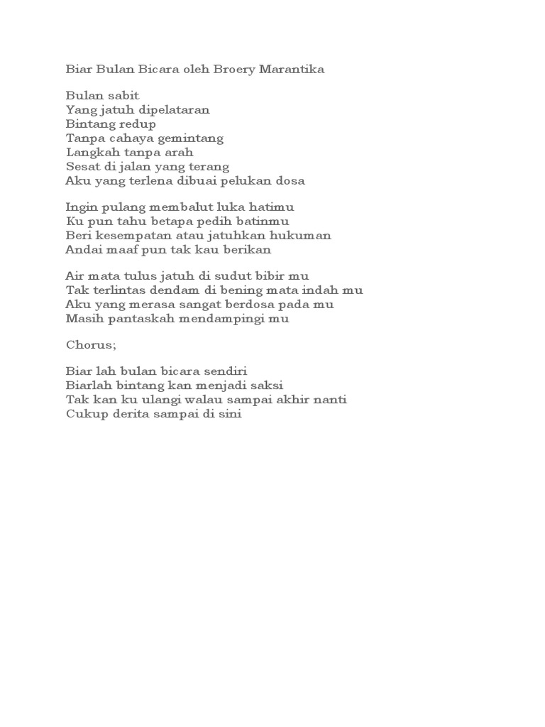 Biarlah Bulan Bicara from imgv2-1-f.scribdassets.com Lirik biarlah bulan bicara sendiri broery marantika (cover by vanny vabiola). Lirik lagu biarlah bulan bicara dari beroery marantika lagu ini adalah salah satu lagu yang dipopulerkan oleh beroery marantika silahkan selengkapnya baca disini. Broery marantika 5 lagu pilihan terbaik memories hit s. Biar lah bulan bicara sendiri biarlah bintang kan menjadi saksi tak kan ku ulangi walau sampai akhir nanti cukup derita sampai di sini. Bulan sabit yang jatuh dipelataran bintang redup tanpa cahaya gemintang langkah tanpa arah sesat di jalan yang terang aku yang terlena dibuai pelukan dosa. Semua pasti tahu dengan almarhum broery marantika. Bulan sabit yang jatuh dipelataran bintang redup tanpa cahaya gemintang langkah tanpa arah sesat di jalan yang terang aku yang terlena dibuai pelukan dosa. Dapatkan lirik lagu lain oleh nella kharisma di kapanlagi.com.